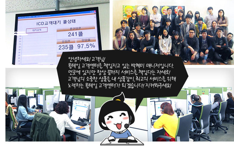 한국의 통합 고객센터 및 콜센터(30명)는 중국본사직원들과 함께 업무 공유 시스템을 이용,함께 공조하고 있습니다.