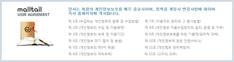 Malltail Inc. (이하 “회사”라 함)는 정보통신망 이용촉진 및 정보보호 등에 관한 법률, 개인정보 보호법 등 개인정보와 관련된 법령상의 규정들을 준수하고 있으며, 개인정보 처리방침을 제정하여 이용자의 권익 보호에 최선을 다하고 있습니다. 회사는 개인정보 처리방침을 통하여 이용자의 개인정보가 어떠한 용도와 방식으로 이용되고 있으며, 개인정보보호를 위해 회사가 어떠한 조치를 하는지 알려드립니다. 회사는 개인정보 처리방침을 개정하는 경우 웹사이트 공지사항(또는 개별공지)을 통하여 공지할 것입니다.