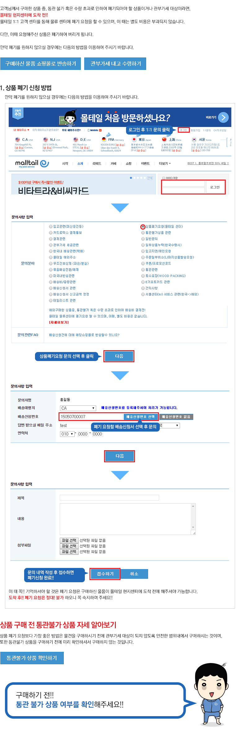 구매하신 물품 쇼핑몰로 반송하기 관부가세 내고 수령하기 통관불가 상품 확인하기